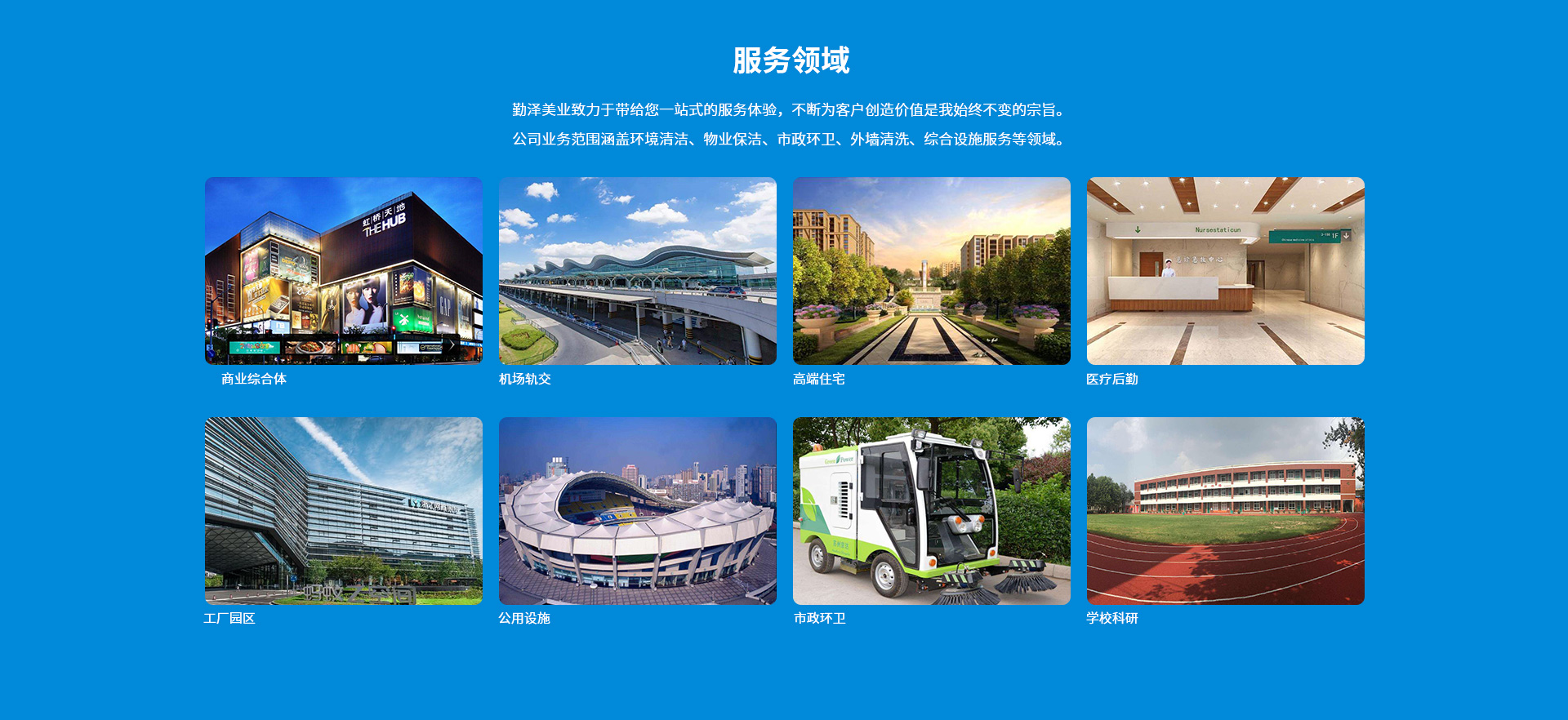公司致力于把“勤澤美業(yè)”培育成眾口皆碑、令人尊敬、具有長期價值的服務領(lǐng)袖品牌。業(yè)務范圍涵蓋環(huán)境清潔和綜合設(shè)施管理服務,公司具備環(huán)衛(wèi)、保潔、石材等多個行業(yè)一級資質(zhì),致力成為中國環(huán)境服務行業(yè)的領(lǐng)導者。